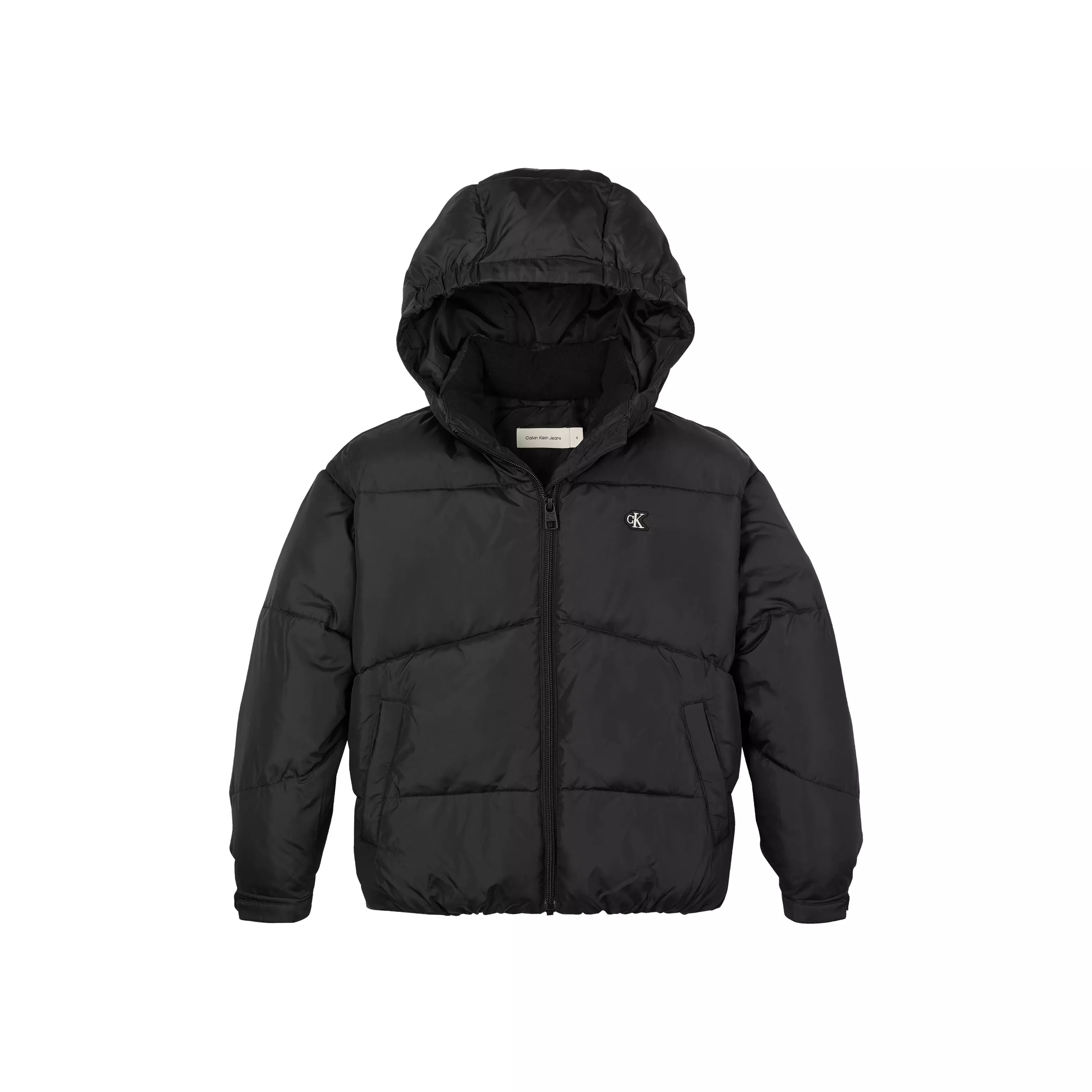 Piumino CALVIN KLEIN nero realizzato al 100% in poliestere riciclato certificato, escluse le finiture, isolamento in finta piuma, taglio regolare, con cappuccio, chiusura con zip e velcro, polsini in maglia a costine, tasche profilate in vita, logo