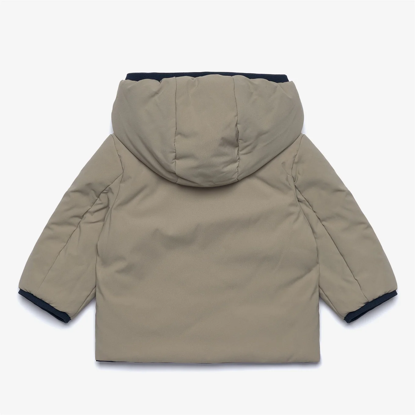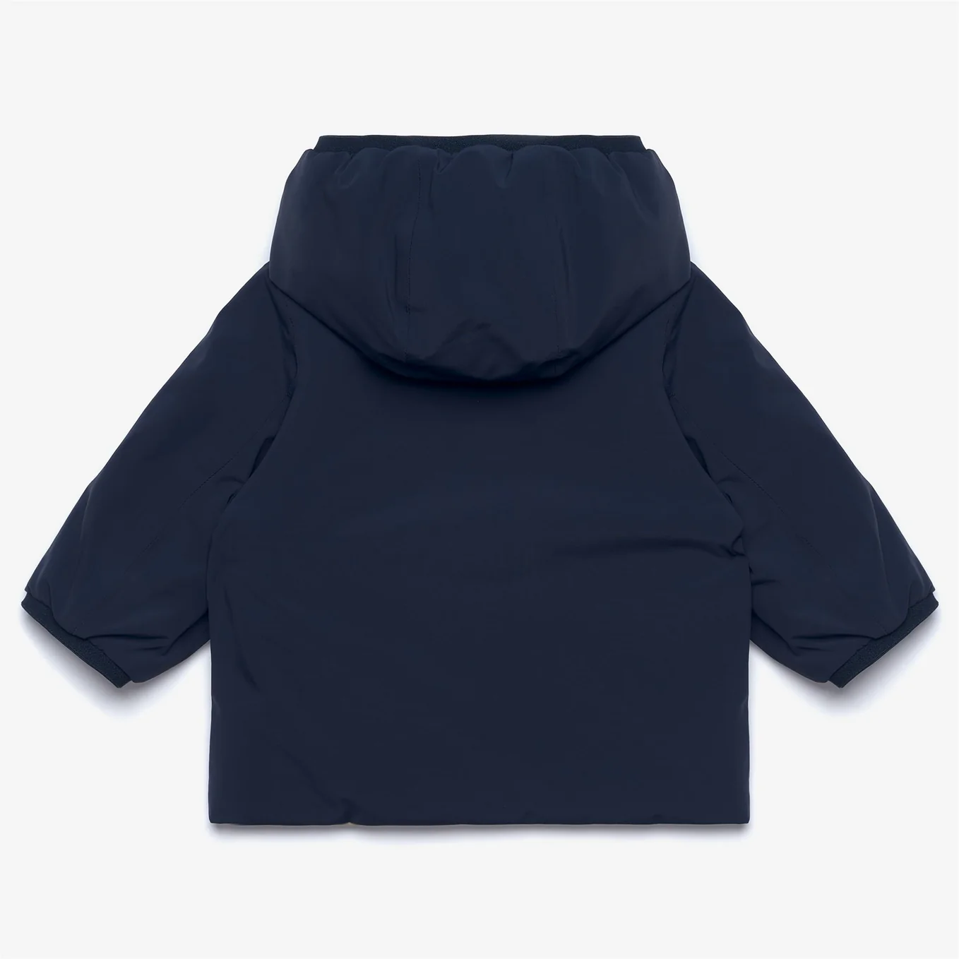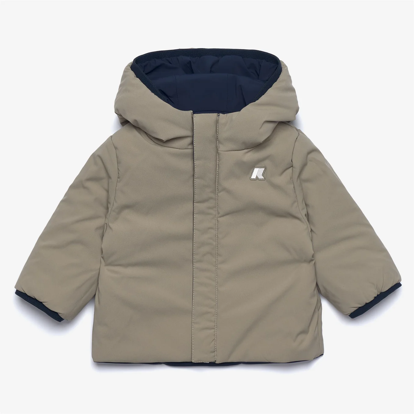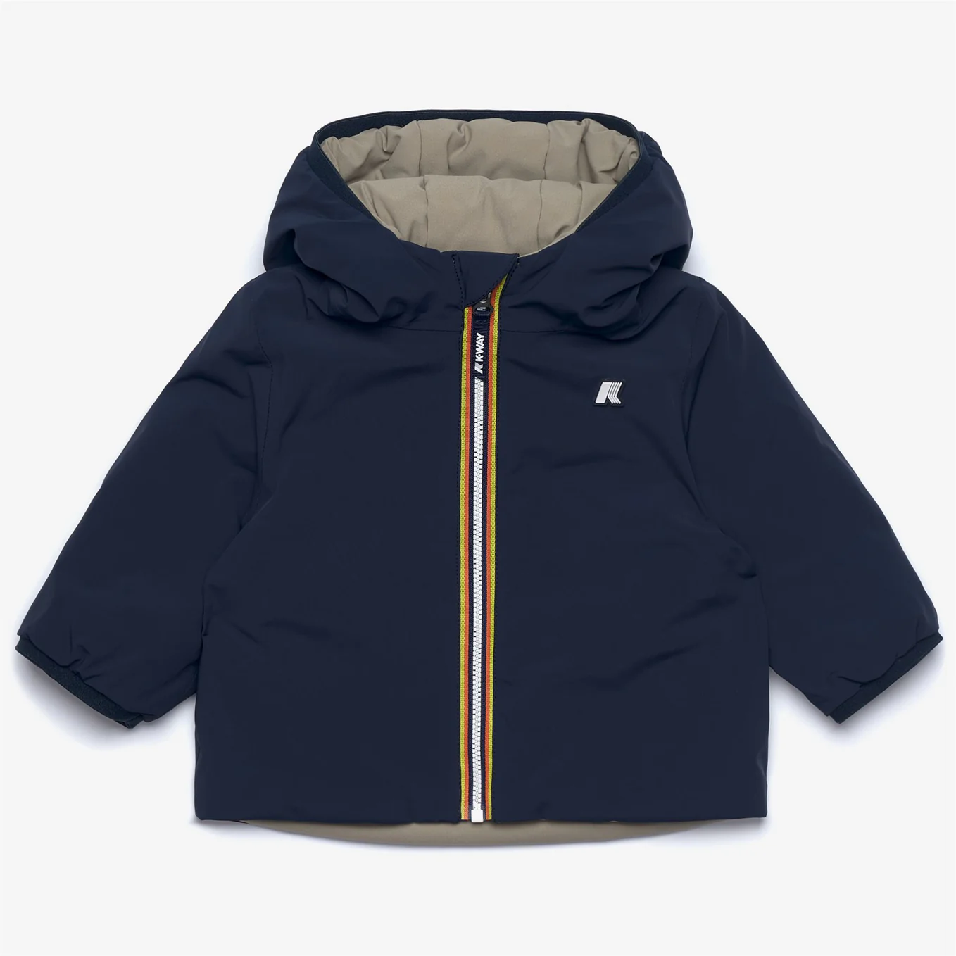 Piumino K-WAY reversibile, tessuto poliestere elasticizzato impermeabile, idrorepellente, antivento, traspirante. Imbottitura in ovatta, cappuccio fisso. Chiusura con zip e tirazip in gros grain personalizzato. Polsi con elastico. Logo in silicone bianco
