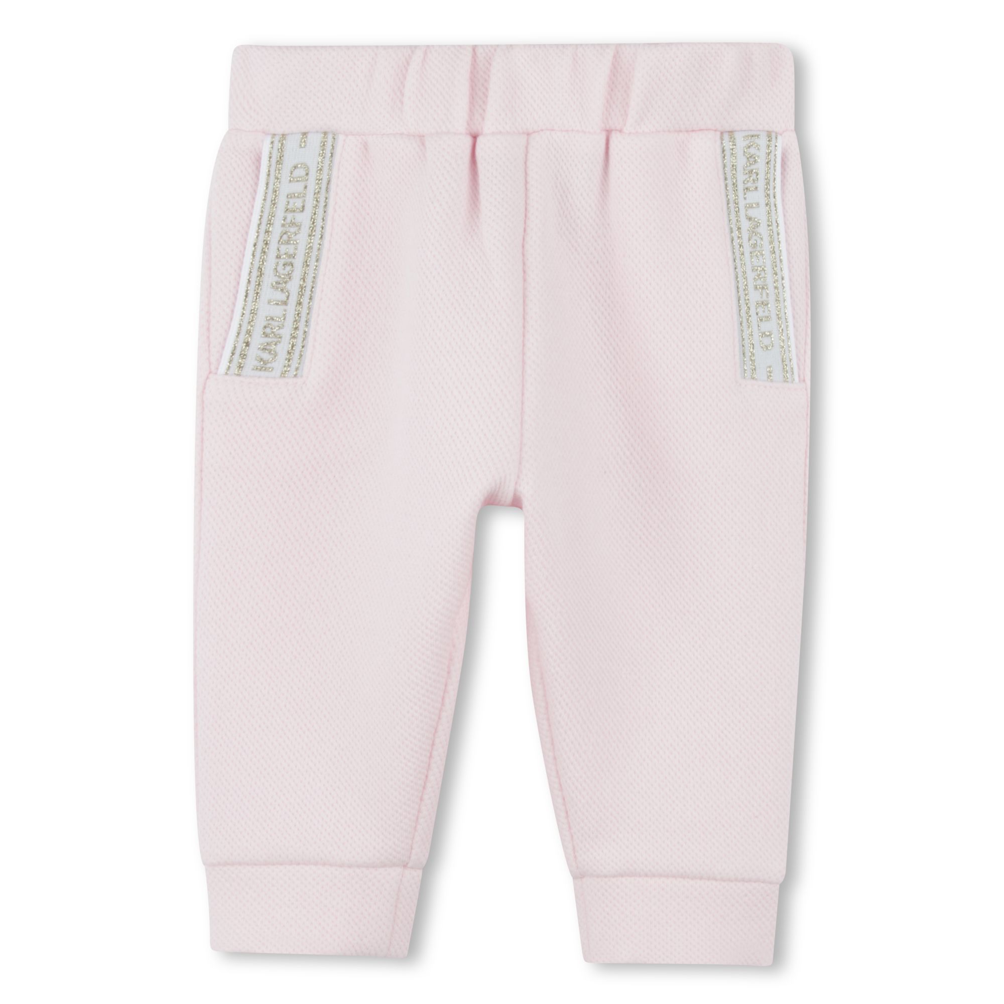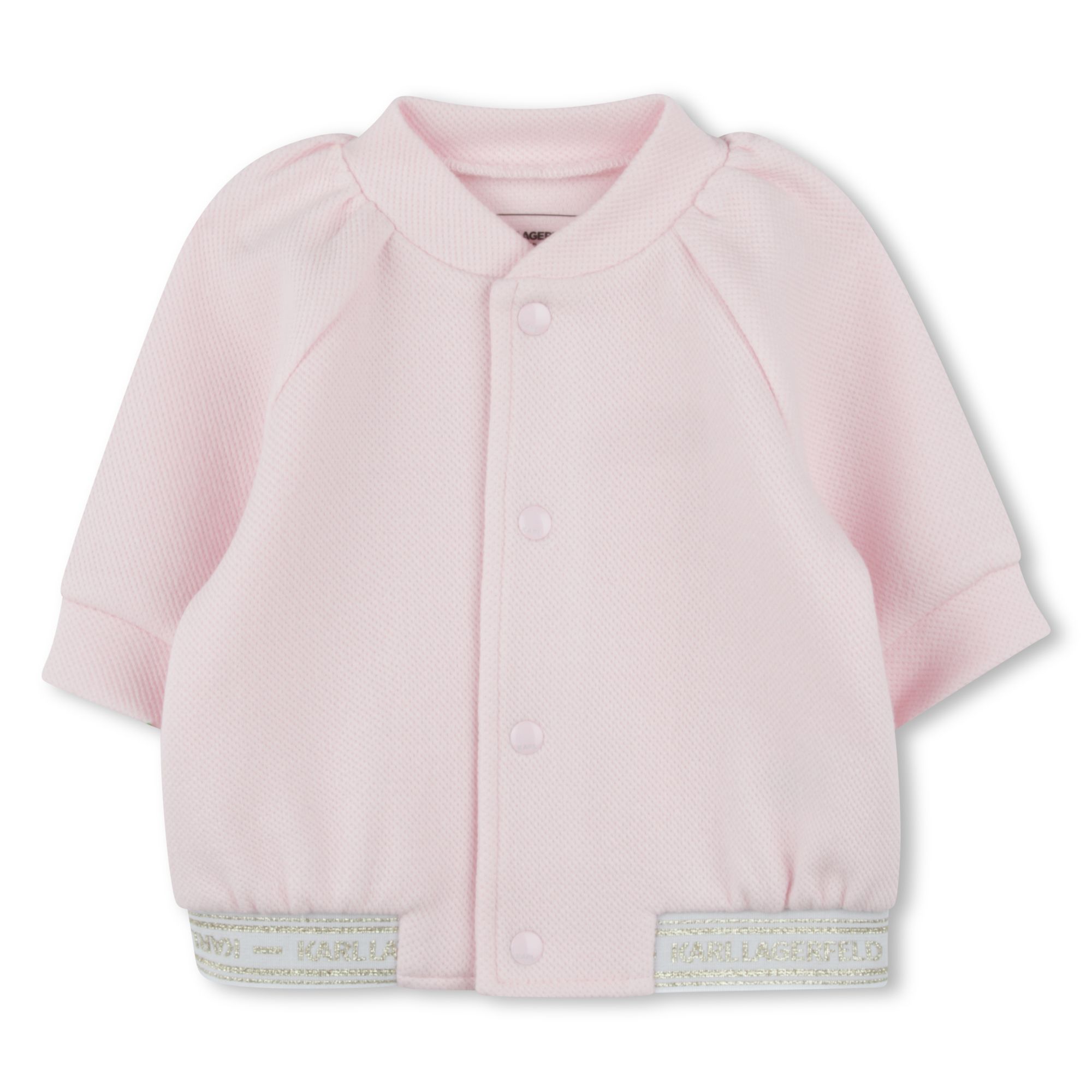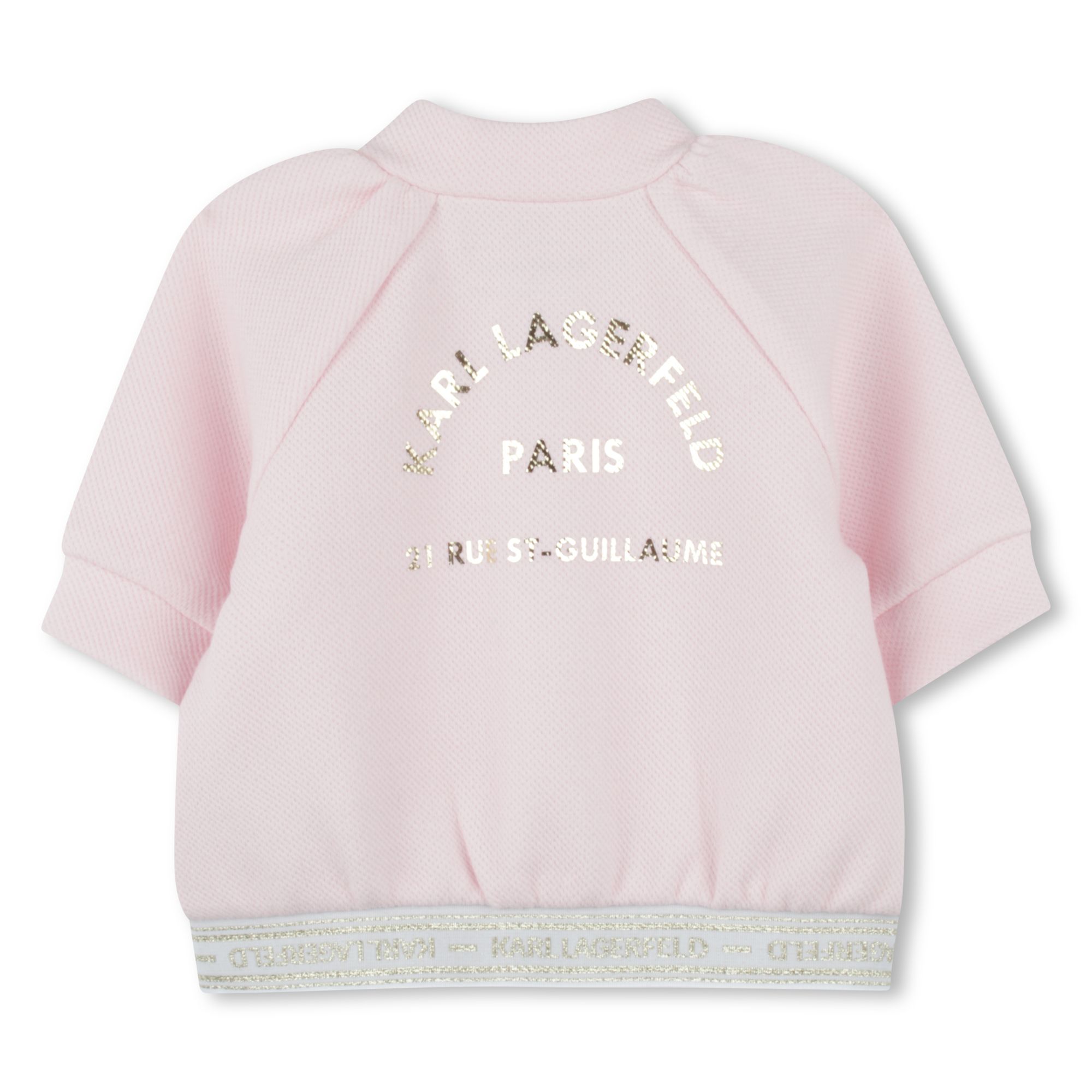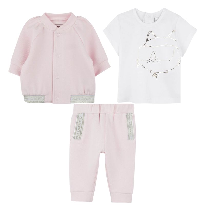 Completo KARL LAGERFELD ROSA 3 pezzi. La felpa presenta maniche lunghe raglan, chiusura con bottoni, vita elasticizzata dorata con marchio e stampa effetto metallico sul retro. T-shirt presenta una manica corta, scollo rotondo, bottoni sul retro e stampa Choupette sul davanti. I pantaloni hanno un elastico in vita e tasche con logo dorato.