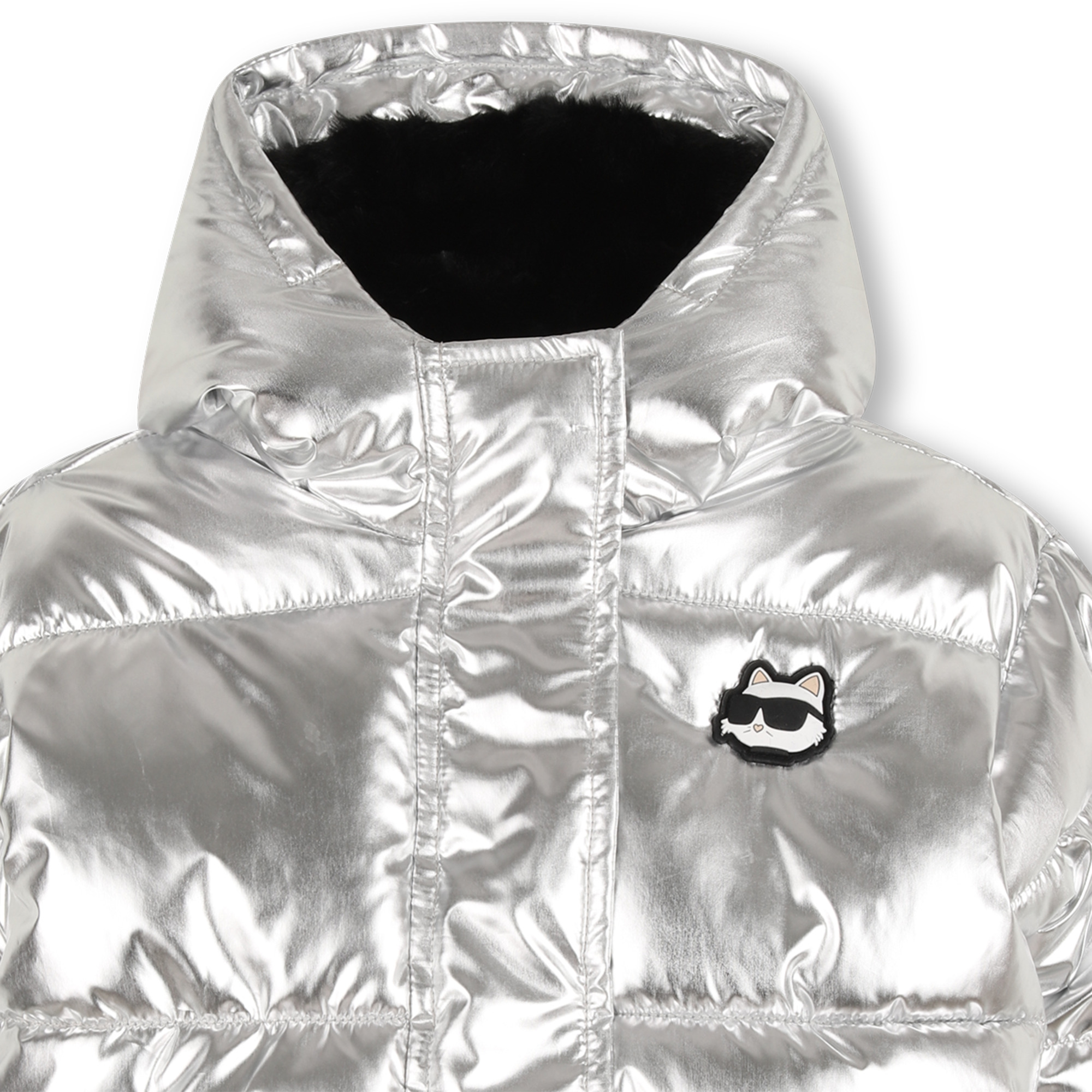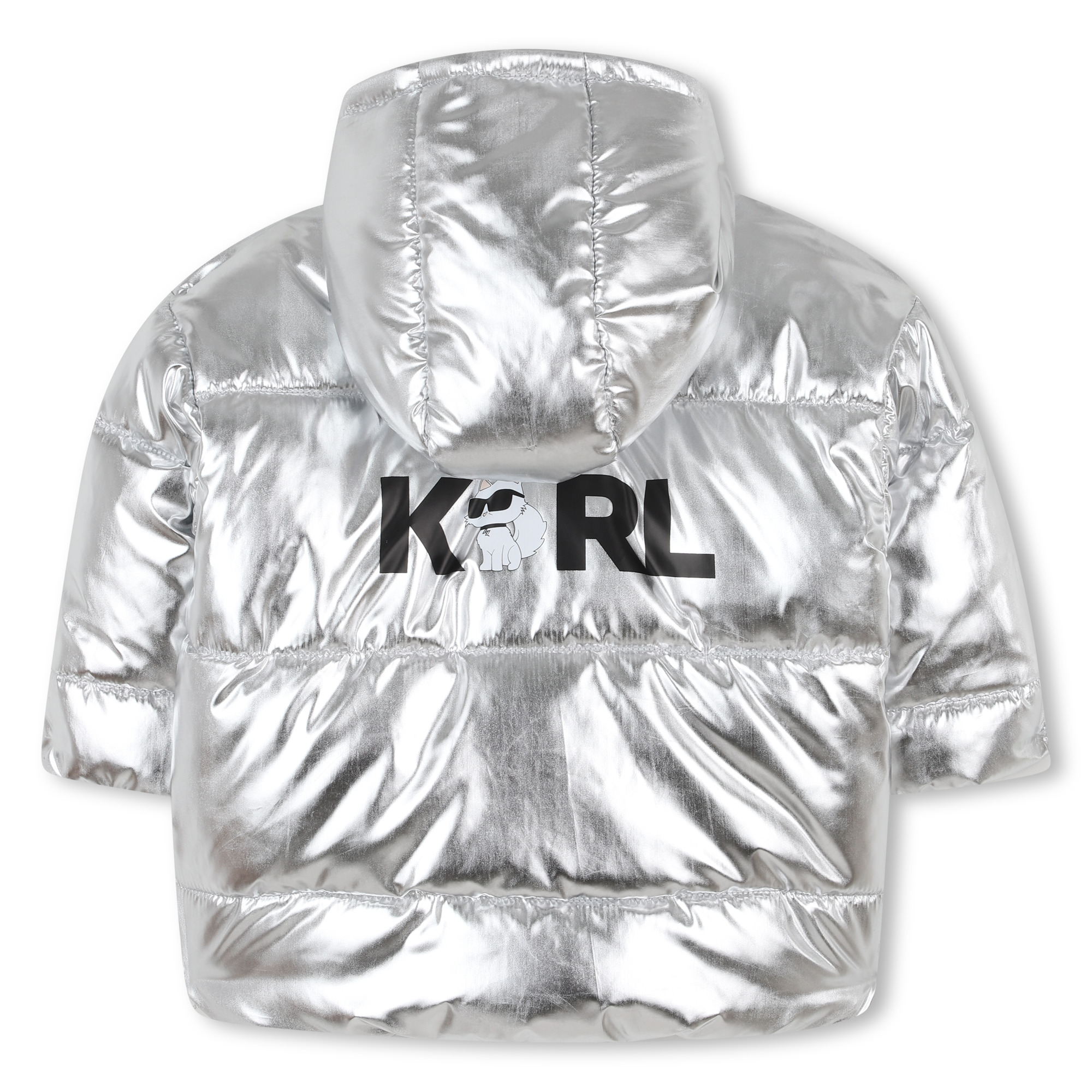 Piumino KARL LAGERFELD argento con pelliccia all' interno, cappuccio, tasche, logo davanti e dietro