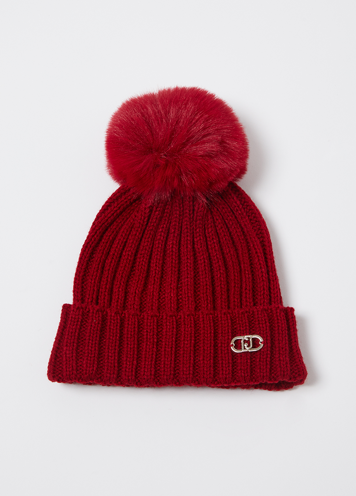Cappello LIUJO rosso in morbida viscosa a costa larga con Maxi Ponpon. Risvolto sulla circonferenza e Placchetta Logo in metallo