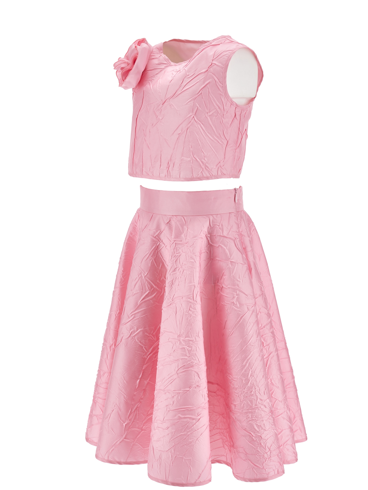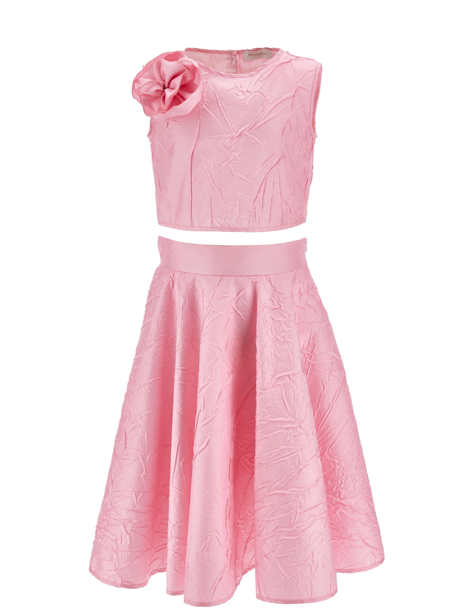 Completo MONNALISA rosa con delicato fiore applicato. Ideale per cerimonie e feste, ispirata a un romanticismo contemporaneo. Tessuti pregiati, dettagli raffinati e le inconfondibili stampe floreali Completo senza maniche con texture microtaffetà.