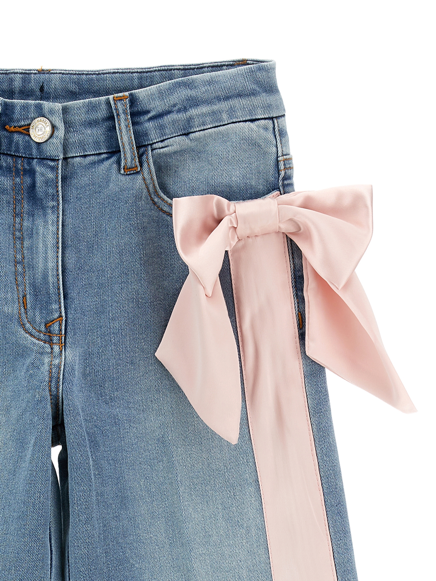 Jeans MONNALISA raffinati con un fiocco applicato su un lato, con nastro che scende fino allorlo, dal taglio ampio. Cinque tasche funzionali. Chiusura con bottone e zip. Tessuto morbido e confortevole.