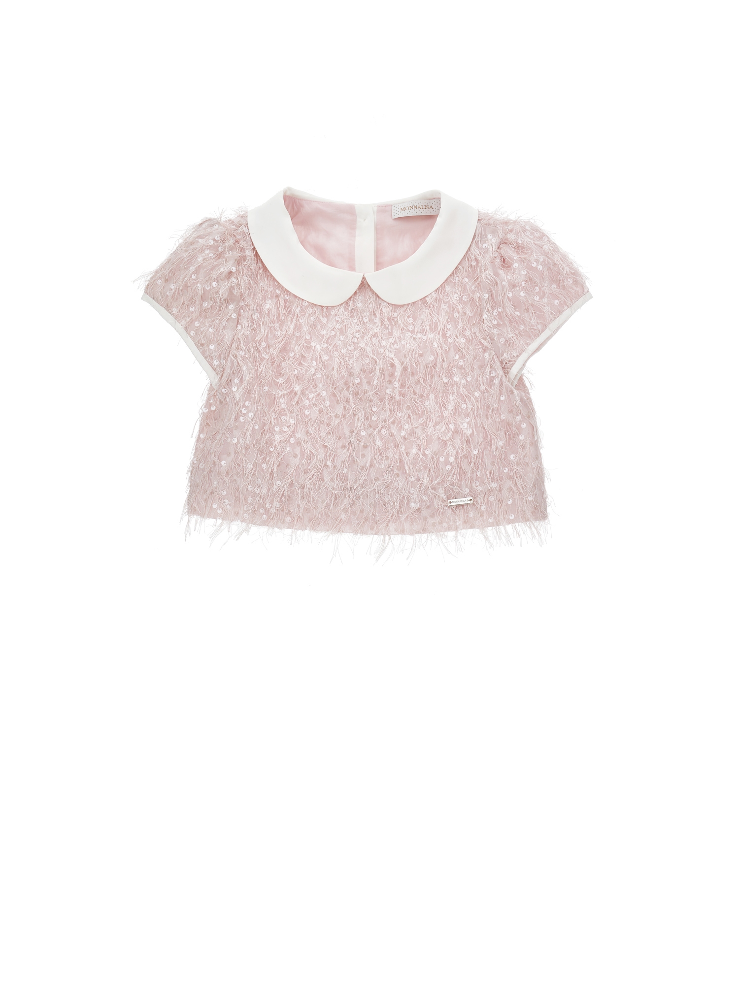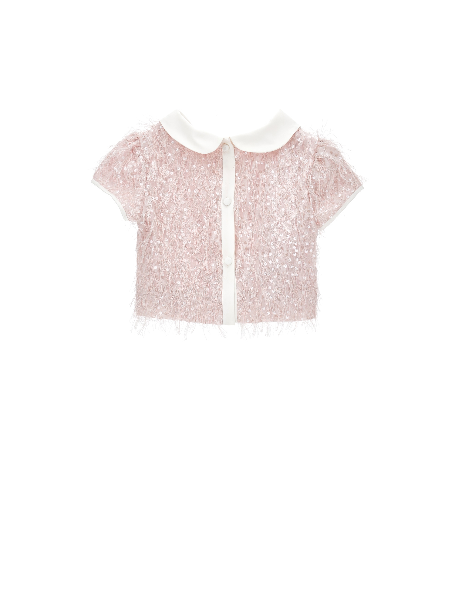 Top MONNALISA realizzato con texture di pailettes e piume lucenti, a maniche corte e colletto per un tocco bon ton. Chiusura posteriore con bottoni gioiello per maggiore praticità.