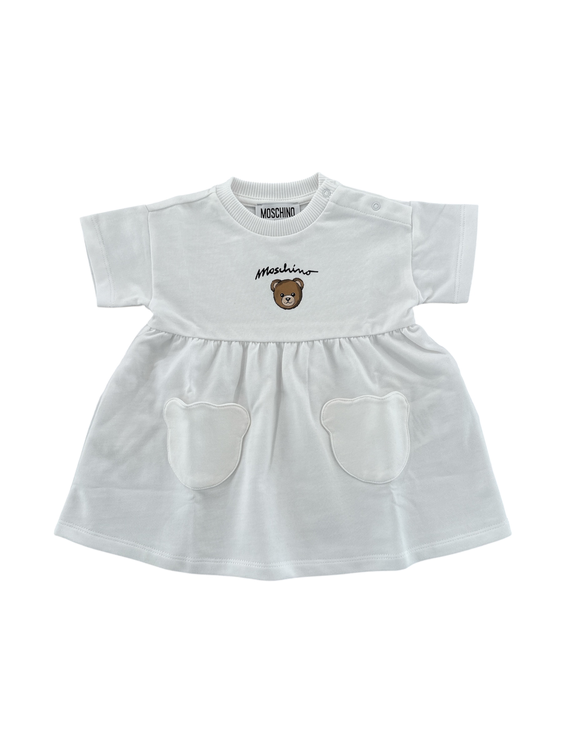 Abito MOSCHINO bianco a manica corta, girocollo, con logo davanti