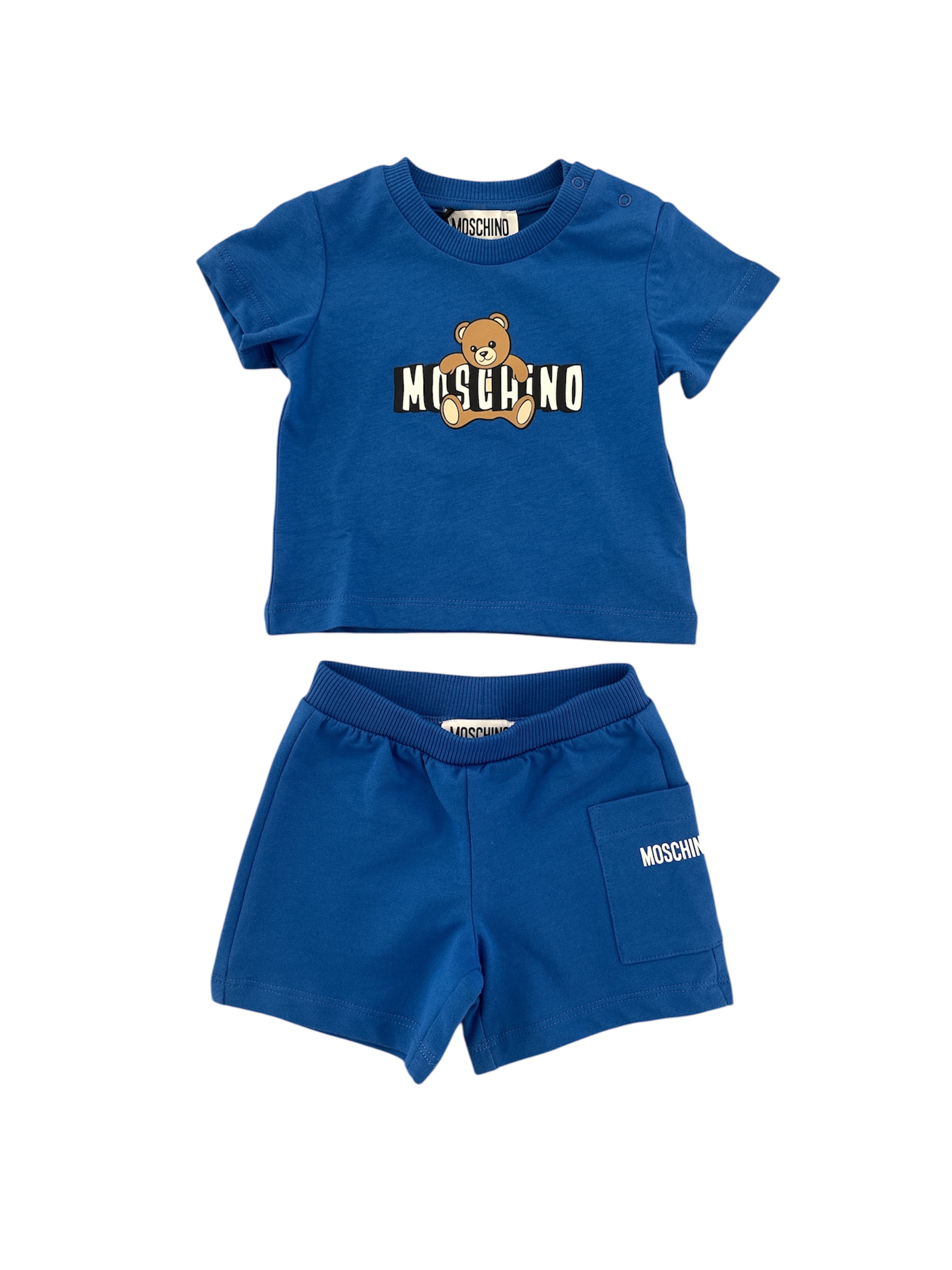 Completo MOSCHINO due pezzi con t-shirt e logo, bermuda con elastico in vita