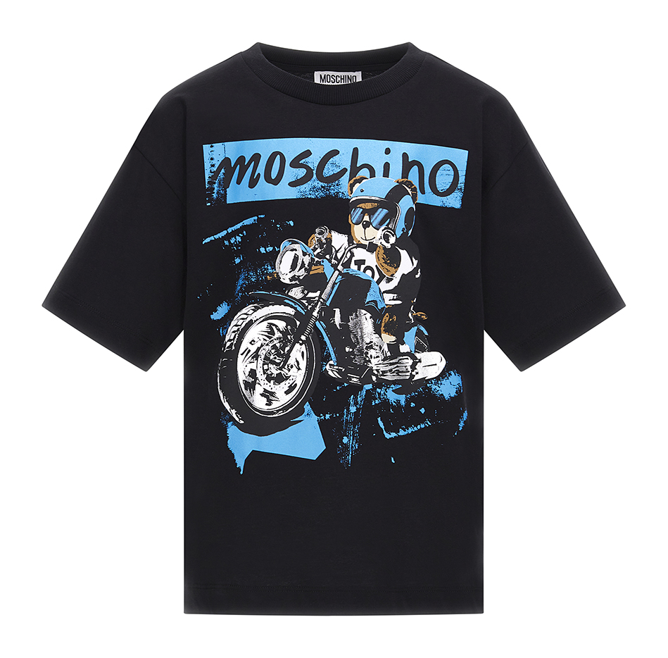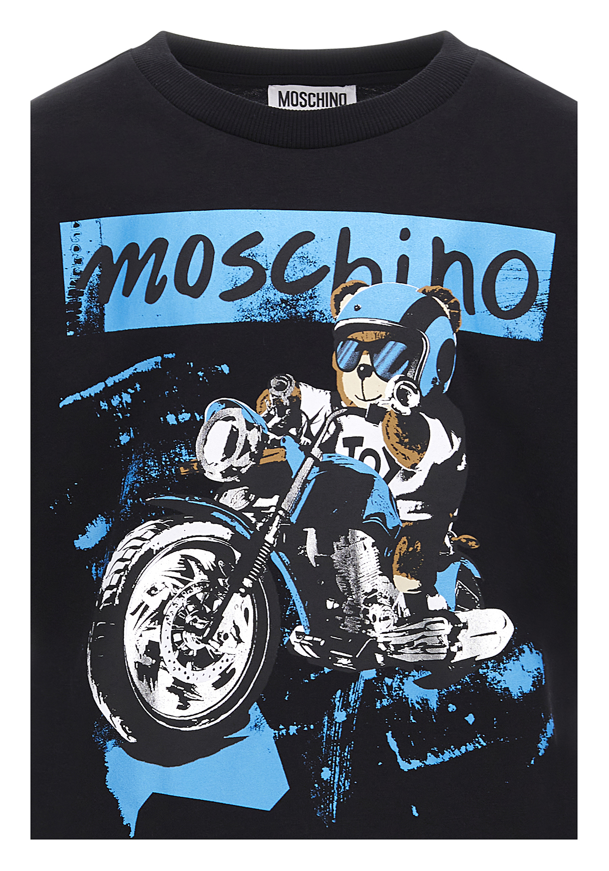 Maxtshirt MOSCHINO nera a girocollo, in cotone, manica corta, con logo e teddy