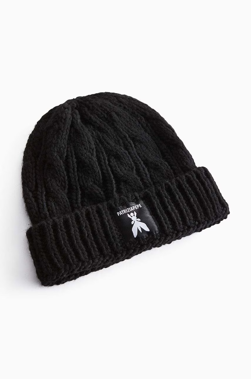 Cappello PATRIZIA PEPE nero modello realizzato in maglia con diversi motivi di tessitura.