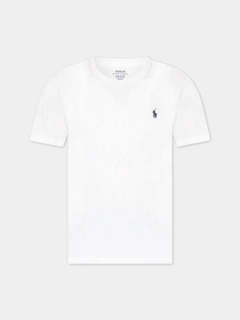 T-shirt RALPH LAUREN bianca, in cotone, con maniche corte e girocollo a costine. E' decorata con iconico cavallino blu.