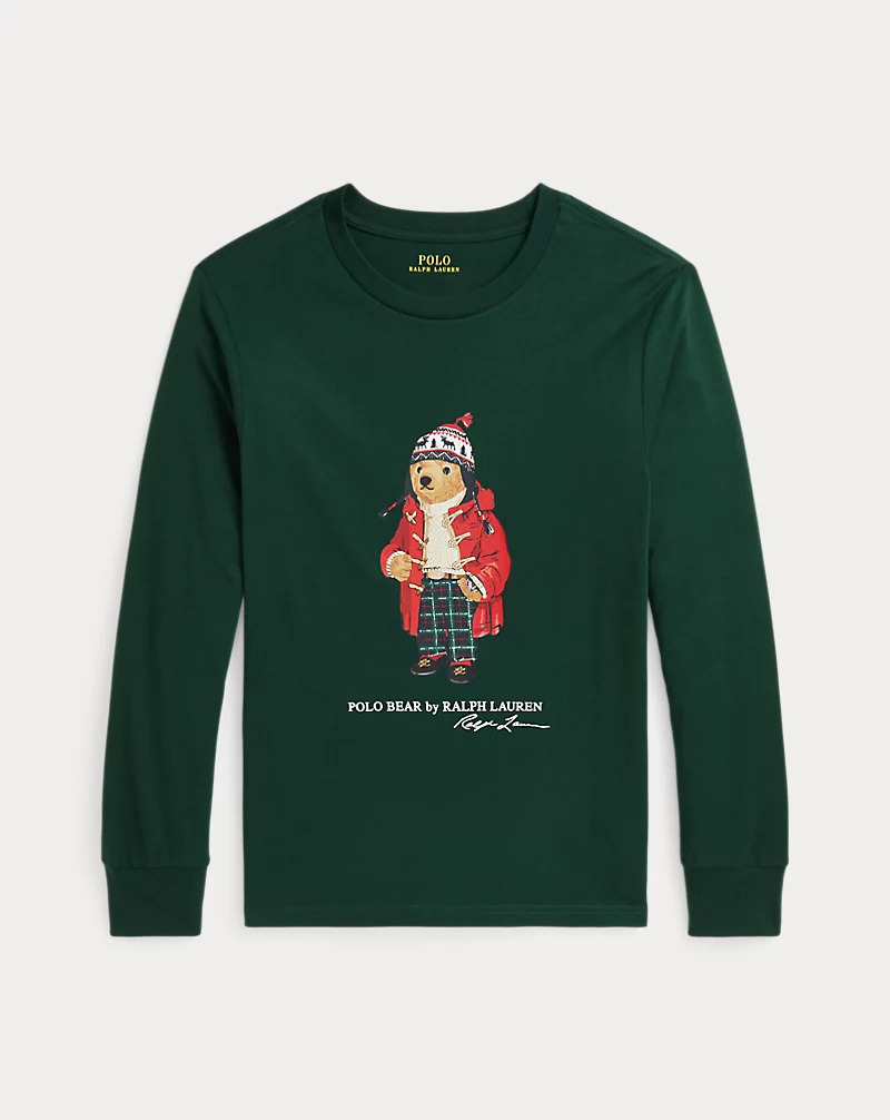 T-shirt RALPH LAUREN verde in jersey di cotone presenta l'iconico Polo Bear con un esclusivo look RL.n Girocollo. Maniche lunghe con polsini a coste.