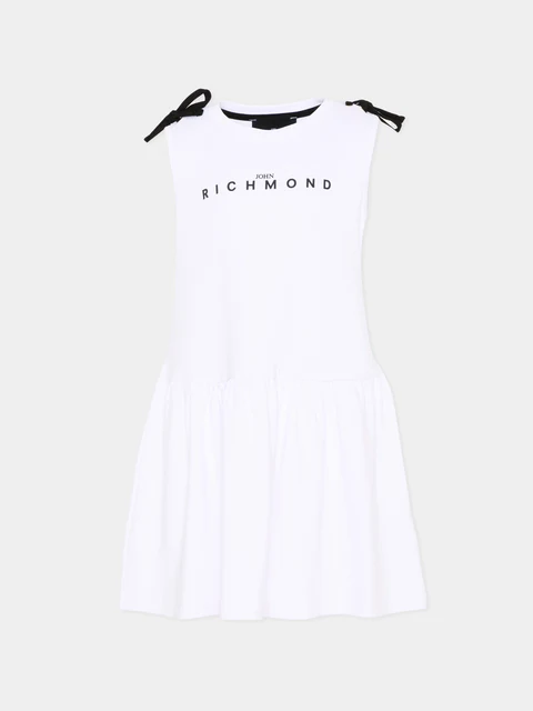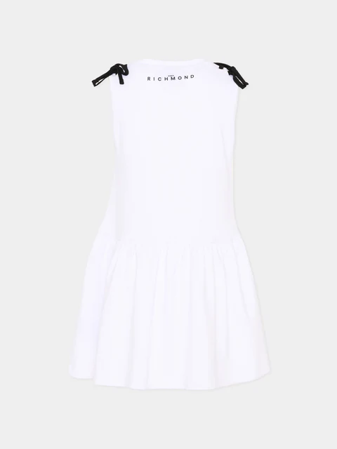 Abito RICHMOND in jersey, con silhouette svasata e linea pulita. Logo frontale a contrasto, ripreso in versione ridotta sul retro per un effetto logomania discreto. Le spalle sono rifinite da fiocchi neri applicati che aggiungono un accento grafico al design essenziale. La gonna arricciata crea volume