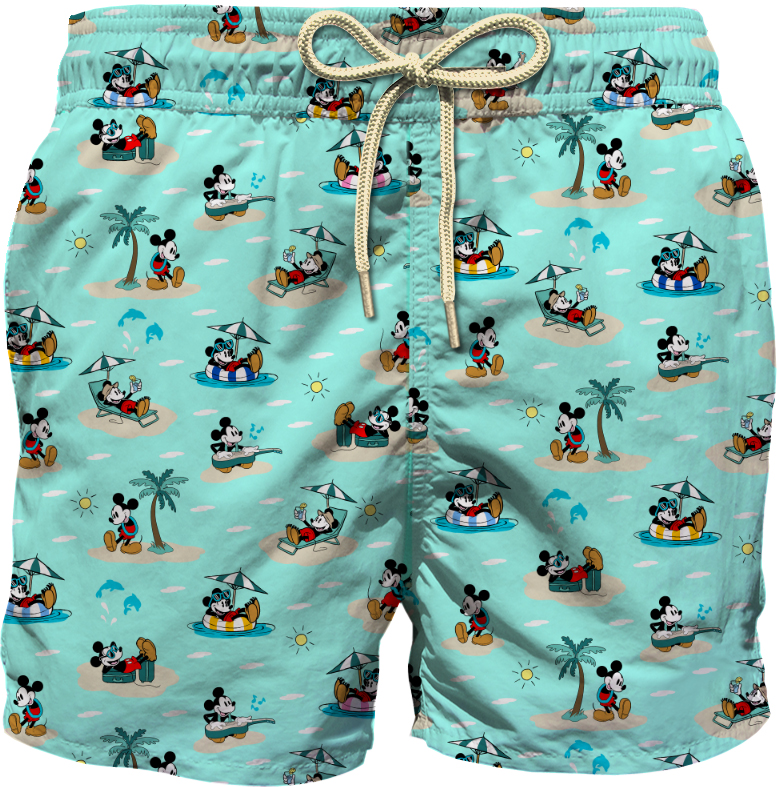 Costume da bagno SAINT BARTH stampa topolino, sfondo azzurro, tessuto leggero, media lunghezza, vestibilità regolare, comoda coulisse in vita, slip interni, chiusura con coulisse. Tasche su entrambi i lati