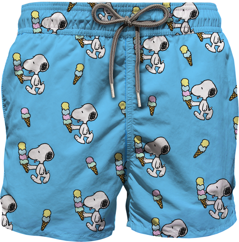 Costume da bagno SAINT BARTH stampa snoopy, sfondo azzurro, tessuto leggero, media lunghezza, vestibilità regolare, comoda coulisse in vita, slip interni, chiusura con coulisse. Tasche su entrambi i lati