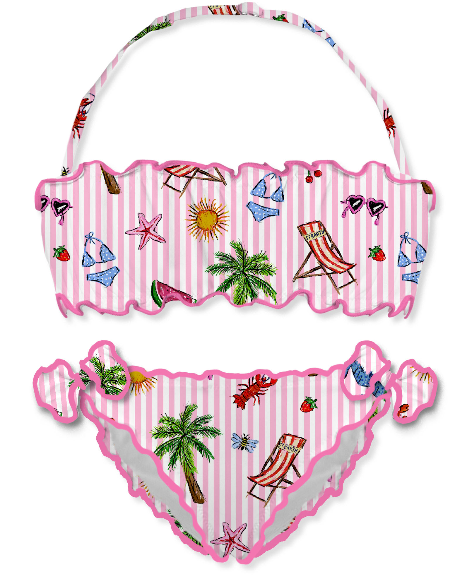 Costume SAINT BARTH due pezzi con bordi arricciati, stampa mare, Top a fascia con laccio regolabile al collo, chiusura posteriore con fiocchi