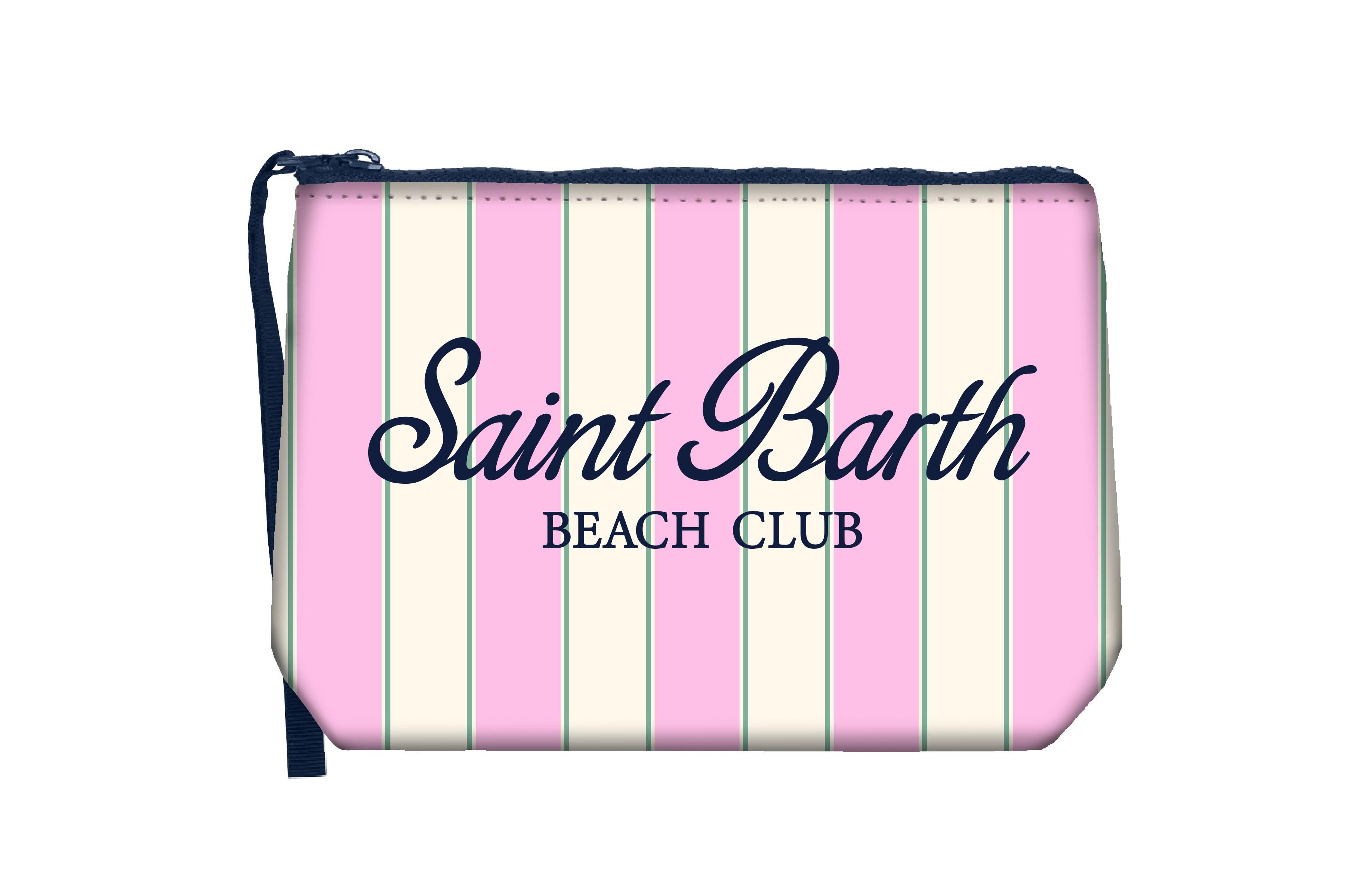 Pochette Aline Beach SAINT BARTH realizzata in tessuto scuba, presenta una fantasia a righe con logo Beach Club a contrasto sul davanti che dona un tocco fresco e distintivo. Dotata di chiusura con zip e laccetto laterale in gros grain.