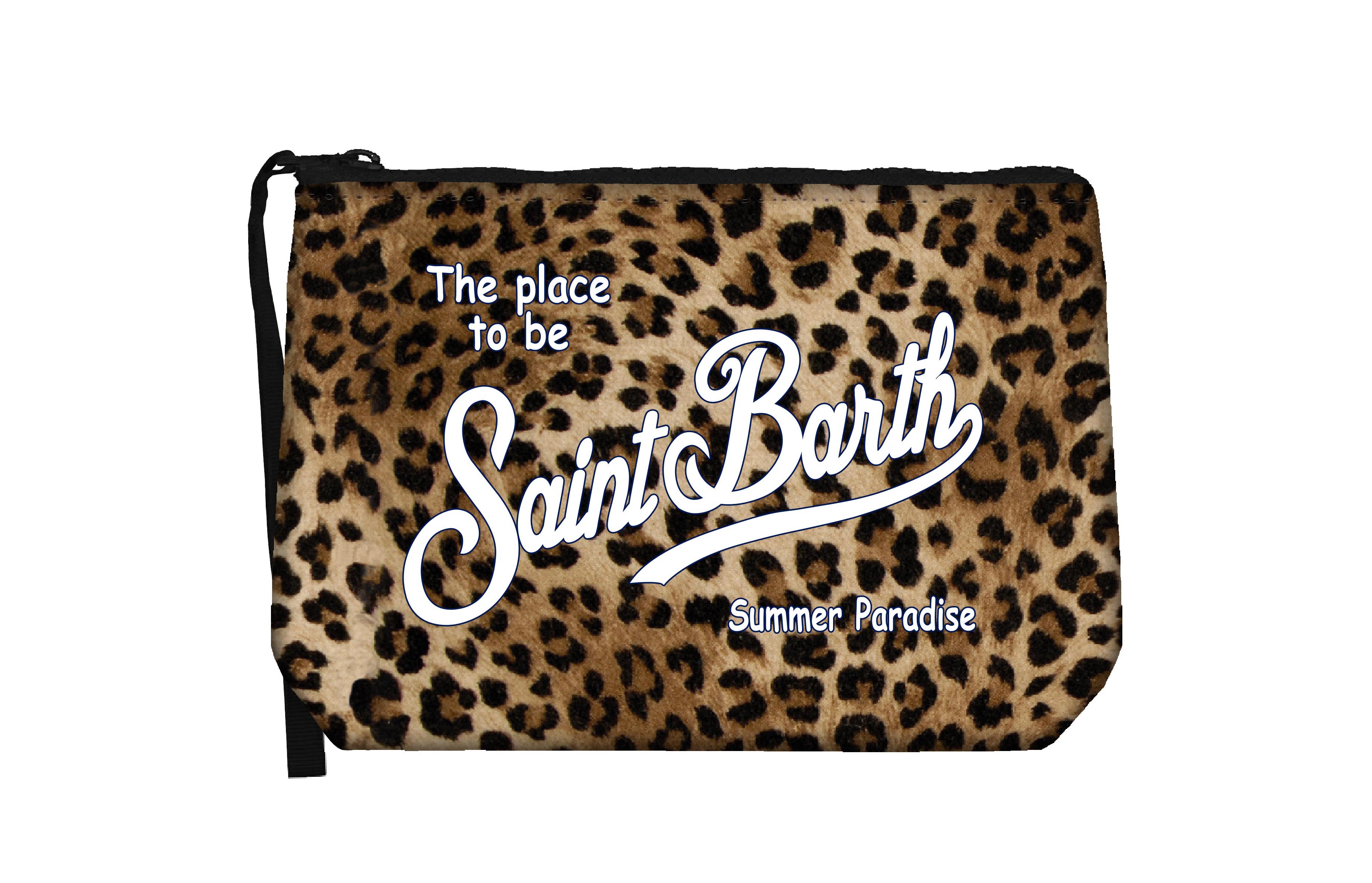 Pochette Aline Classic SAINT BARTH realizzata in tessuto scuba, leopardata. La chiusura con zip garantisce praticità, mentre il laccetto laterale in nastro gros grain.