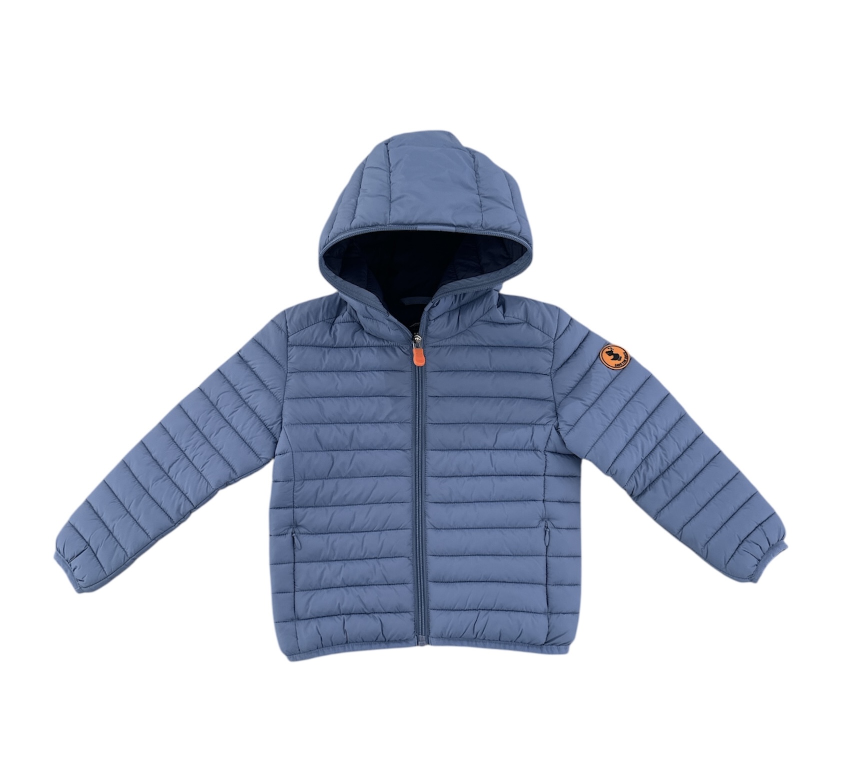 Giubbino SAVE THE DUCK 100 grammi, imbottito e trapuntato, a maniche lunghe, con cappuccio, chiusura frontale con zip, tasche laterali con zip, polsini e orlo elasticizzati; è imbottito con Plumtech, un'ovatta termica sintetica. È decorato con logo gommato arancione sulla manica