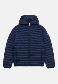 Piumino SAVE THE DUCK 100 grammi, imbottito e trapuntato, a maniche lunghe, con cappuccio, chiusura frontale con zip, tasche laterali con zip, polsini e orlo elasticizzati; è imbottito con Plumtech, un'ovatta termica sintetica. È decorato con logo gommato arancione sulla manica