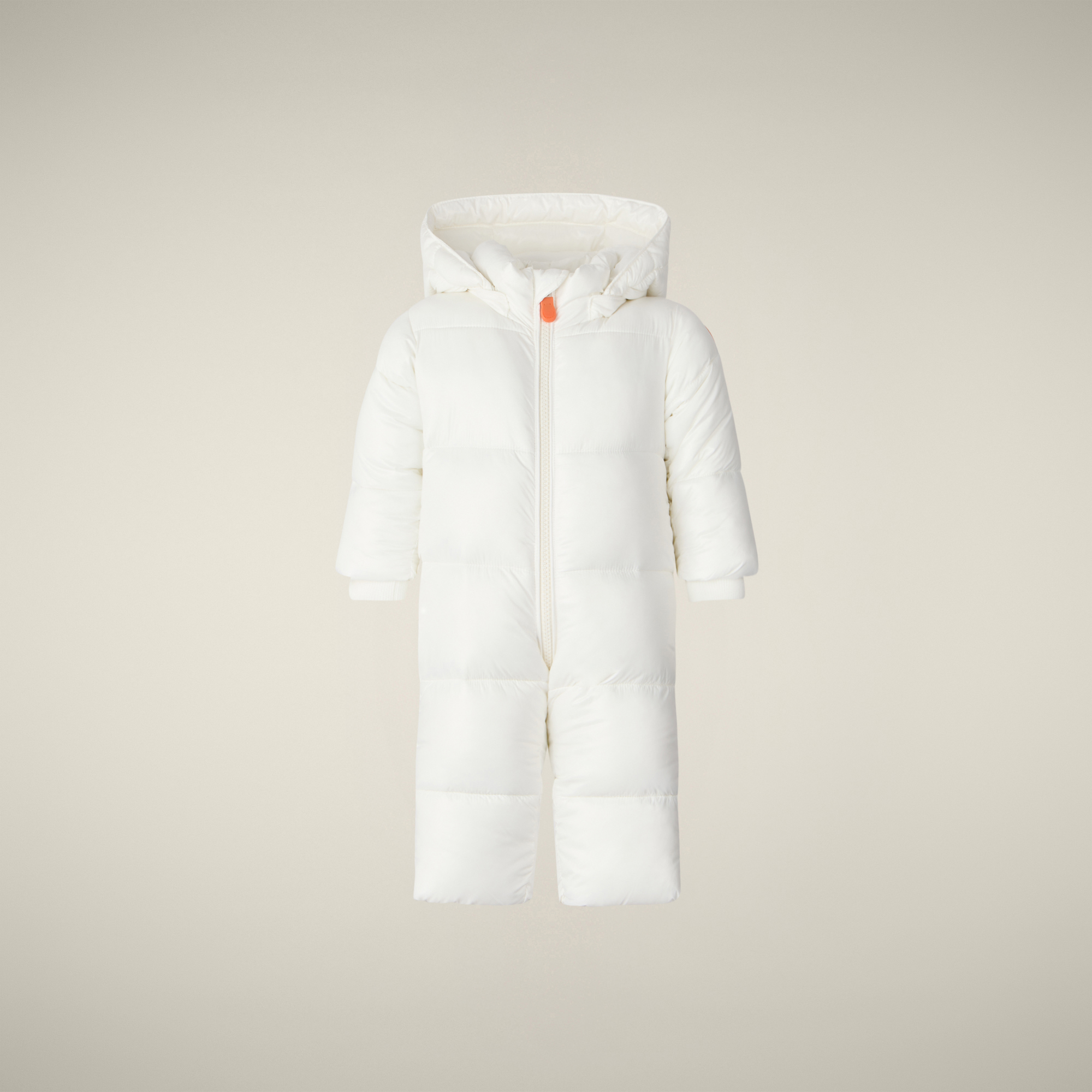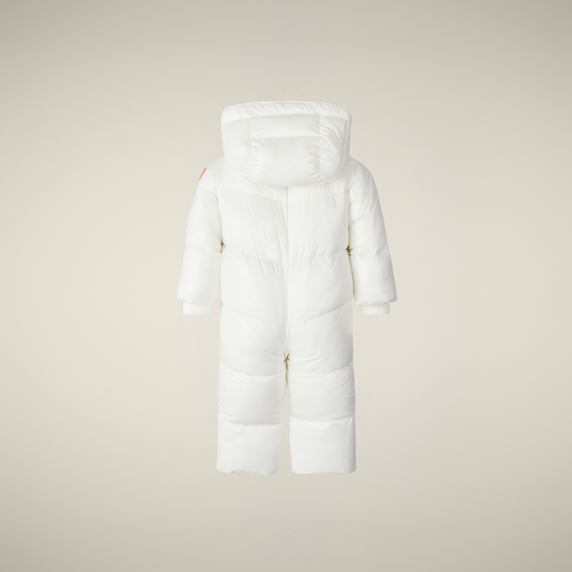 Tutone SAVE THE DUCK è trapuntato e imbottito per tenere al caldo i nuovi arrivati. È completa di un pratico cappuccio che può essere rimosso grazie a dei bottoni a pressione. Chiusa da zip centrale, ha polsini e fondo gamba bordati all'interno in maglia a costine, con guantini e scarpette foderati in pile e attaccati tramite una fascetta in tessuto e bottoncini.