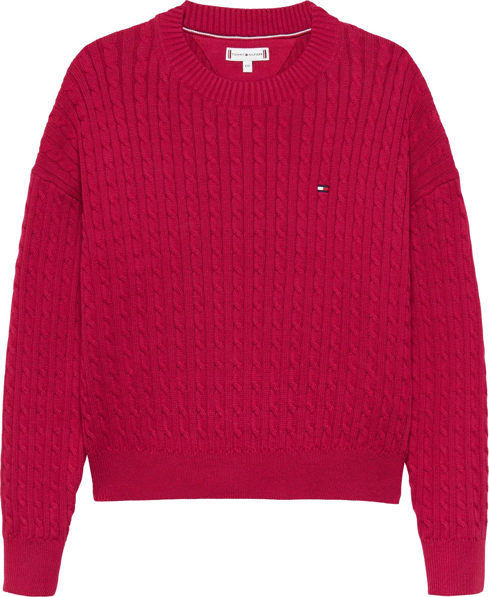 Maglia TOMMY HILFIGER fragola in puro cotone pettinato, lavorazione a maglia intrecciata, girocollo, collo, polsini e fondo a coste, bandierina Tommy Hilfiger ricamata sul petto