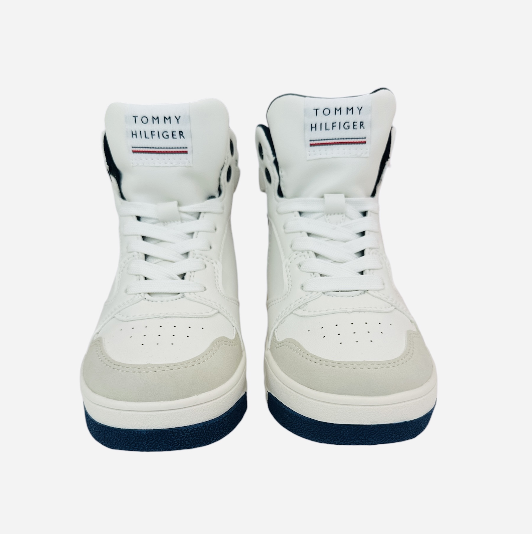 Sneakers TOMMY HILFIGER bianche alte, soletta rimovibile in cotone e cotone riciclato, suola in gomma termoplastica riciclata, dettaglio iconico sul lato